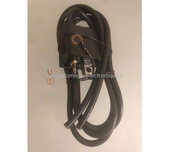 Sur les bobines haute tension montées d'origine le fils qui va au boitier électronique sort de la bobine, sur les notre vous devrez couper la cosse qui vient du boitier et la changer par une cosse plate livrée avec.